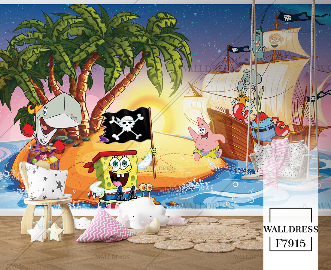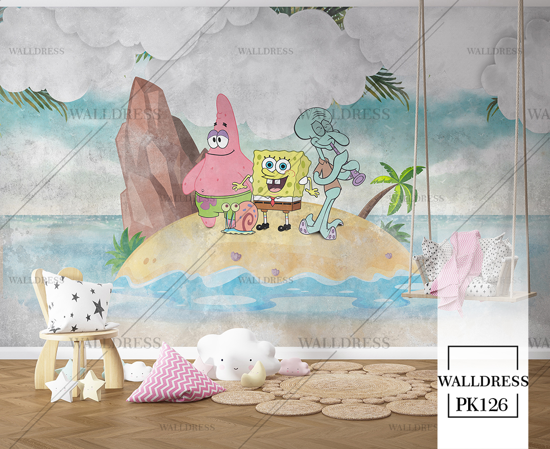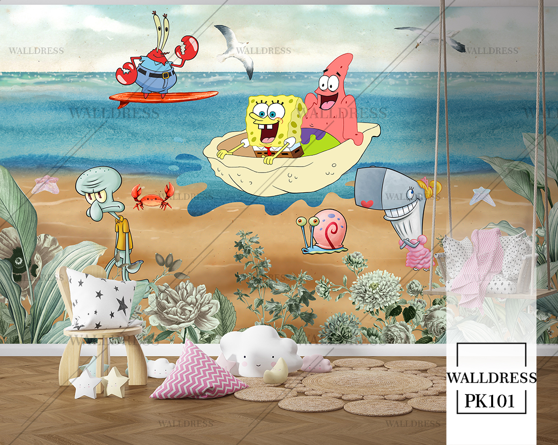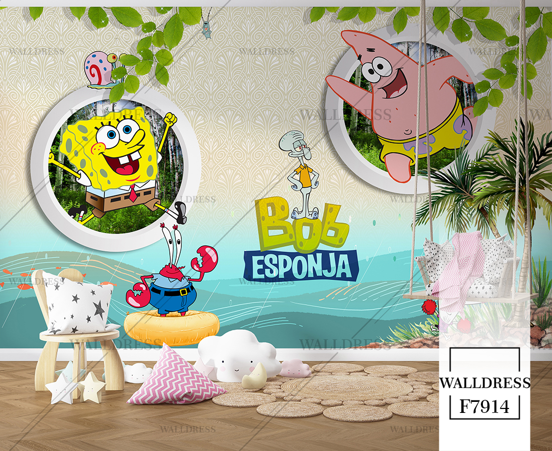 کاغذ دیواری طرح باب اسفنجی مخصوص اتاق کودک