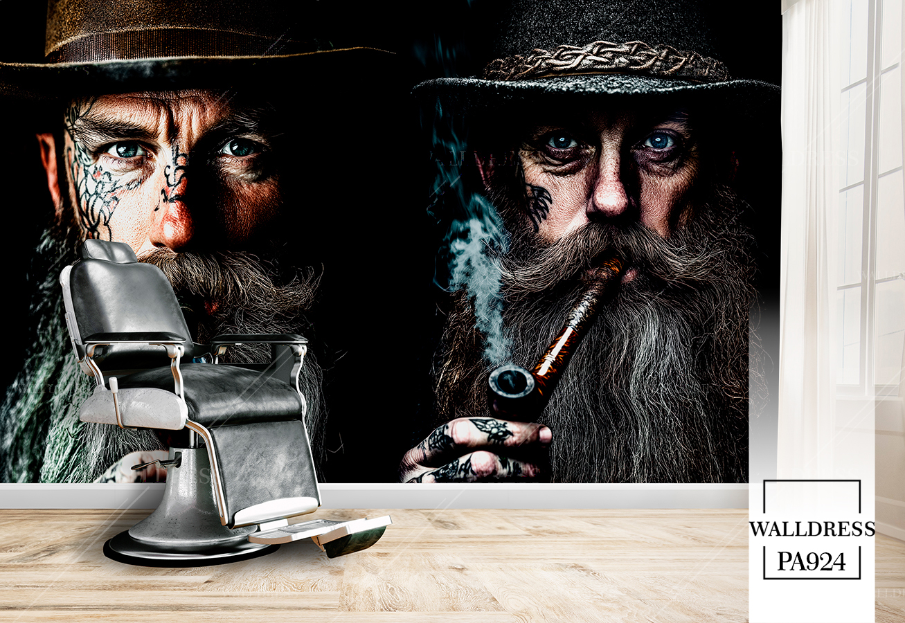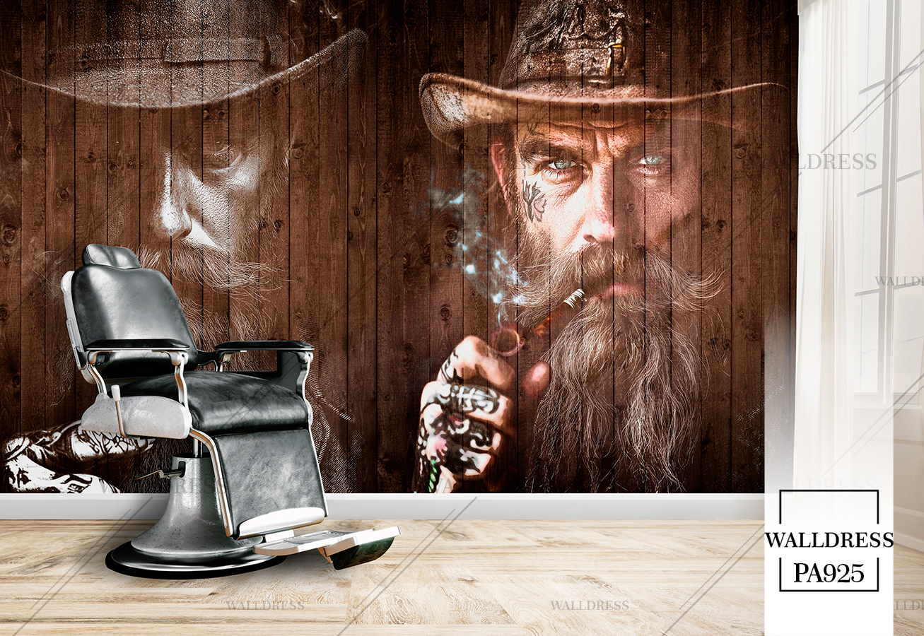 طرح جدید و لوکس و مدرن پوستر و کاغذ دیواری مردانه مخصوص باربرشاپ با طرح مدل مو، ریش و ابزار اصلاح | پیپ کشیدن زمینه چوبی
