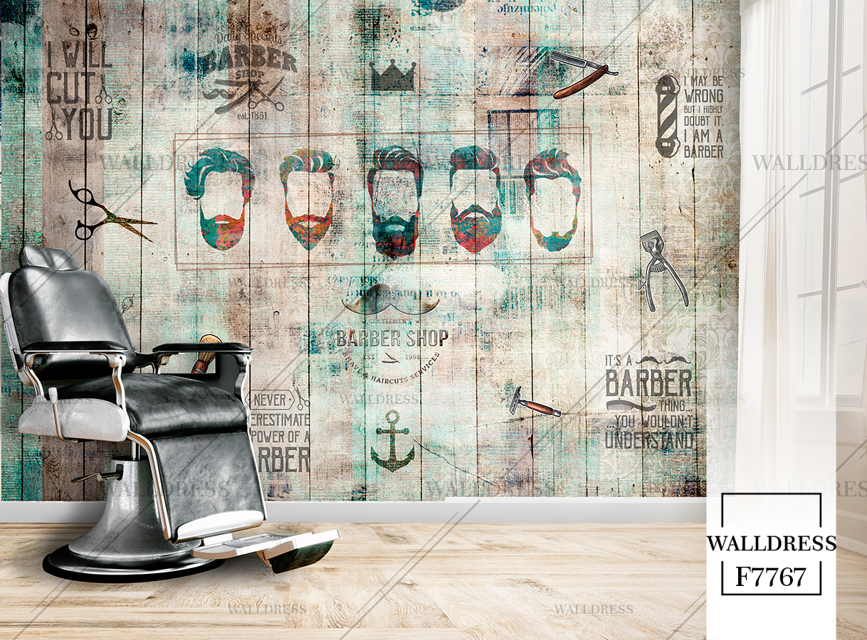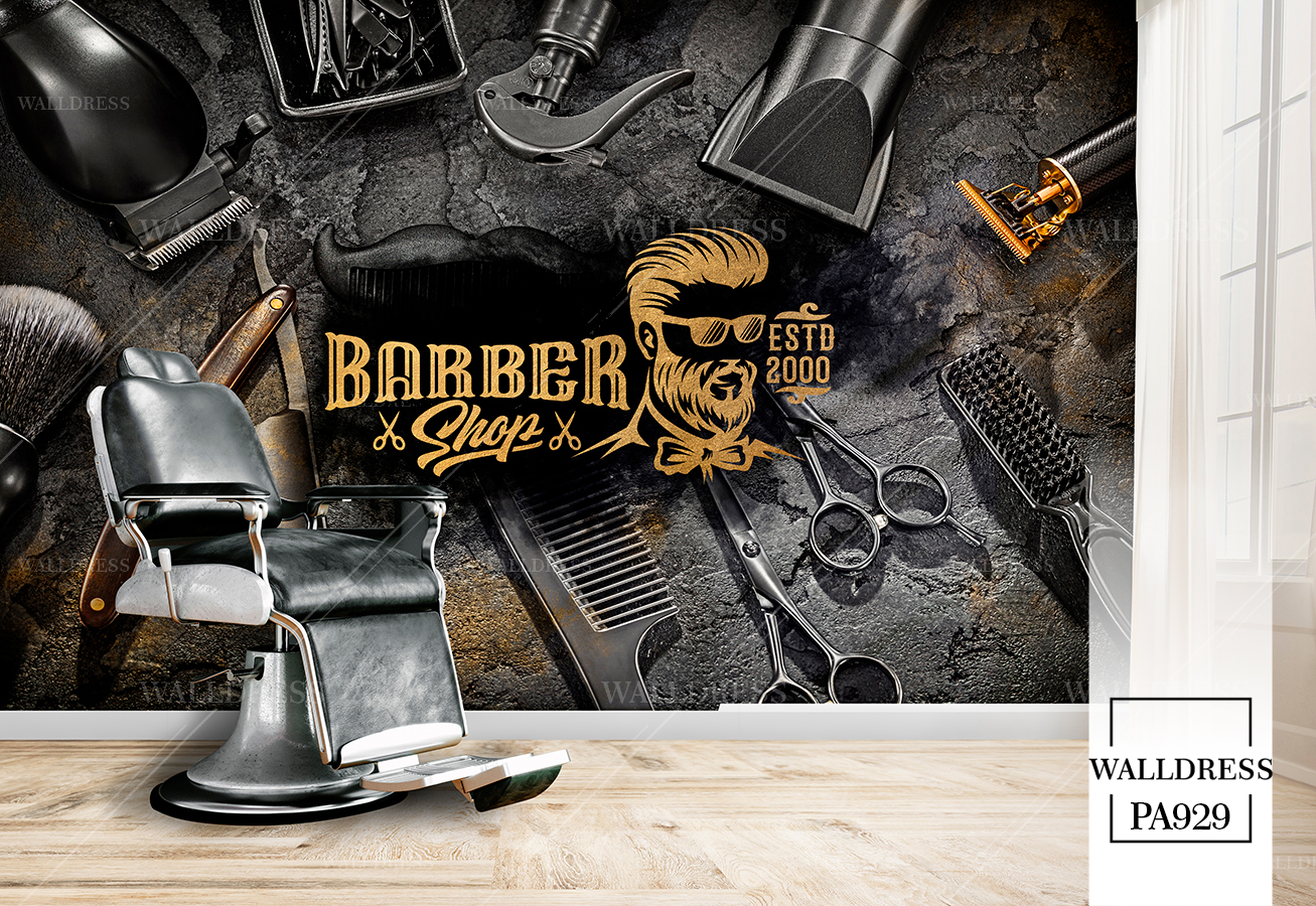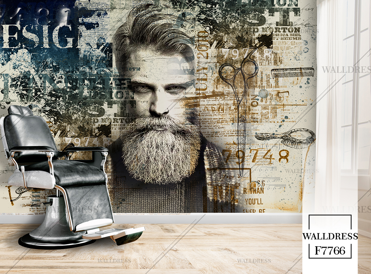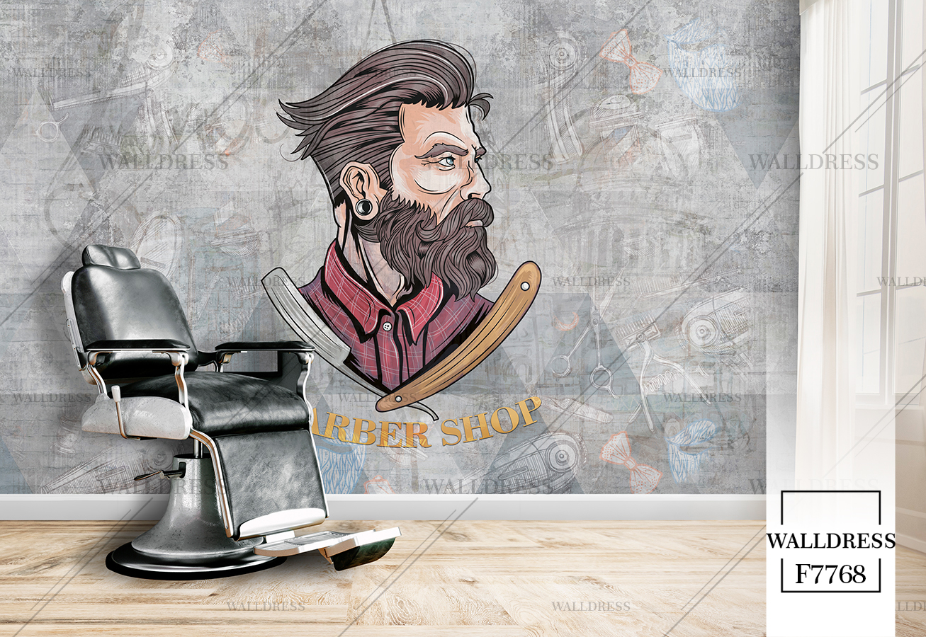طرح جدید و لوکس و مدرن پوستر و کاغذ دیواری مردانه مخصوص باربرشاپ با طرح مدل مو، ریش و ابزار اصلاح