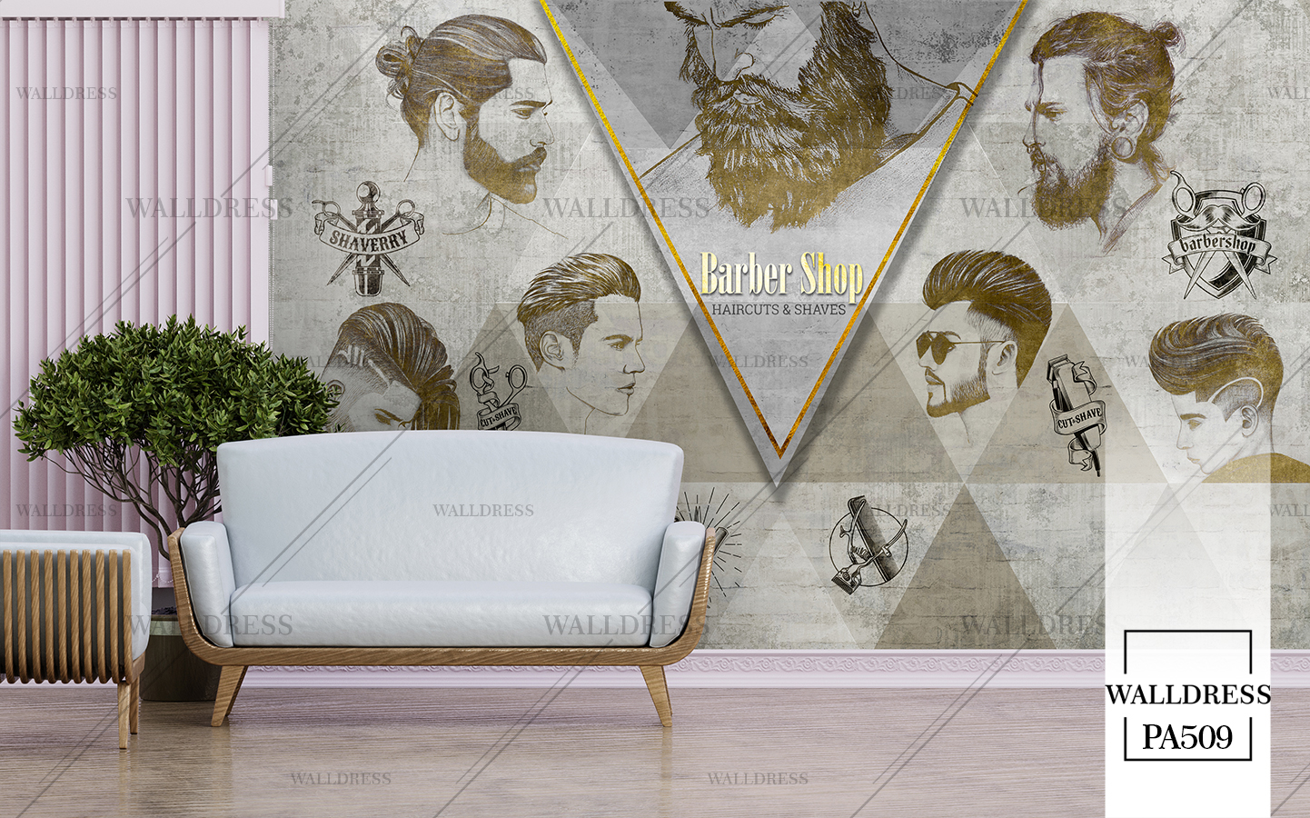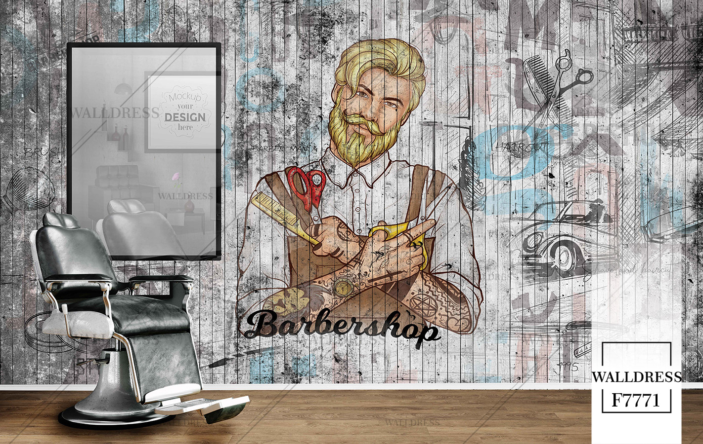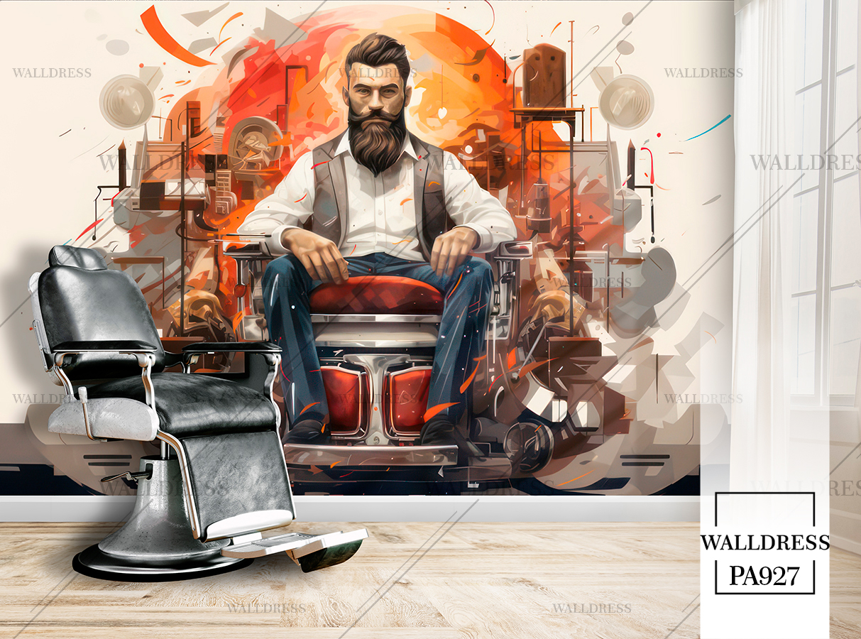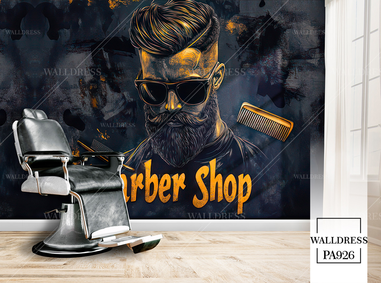 طرح جدید و لوکس و مدرن پوستر و کاغذ دیواری مردانه مخصوص باربرشاپ با طرح مدل مو، ریش و ابزار اصلاح