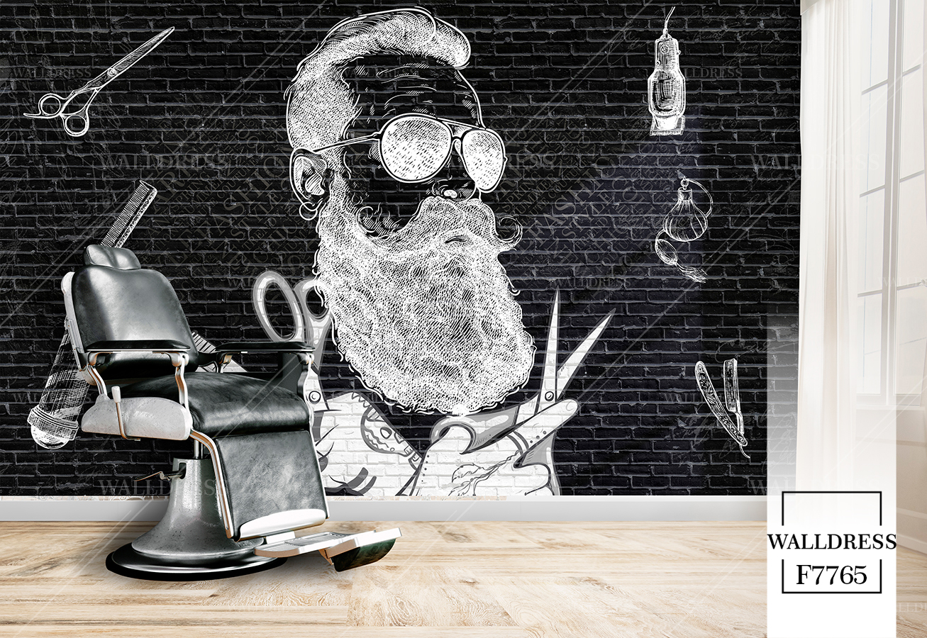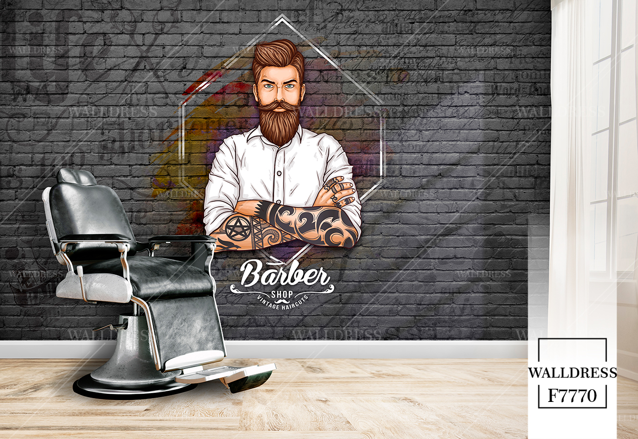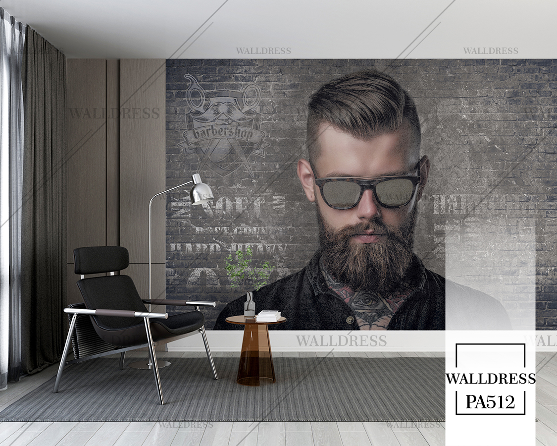 طرح جدید و لوکس و مدرن پوستر و کاغذ دیواری مردانه مخصوص باربرشاپ با طرح مدل مو، ریش و ابزار اصلاح | زمینه آجری