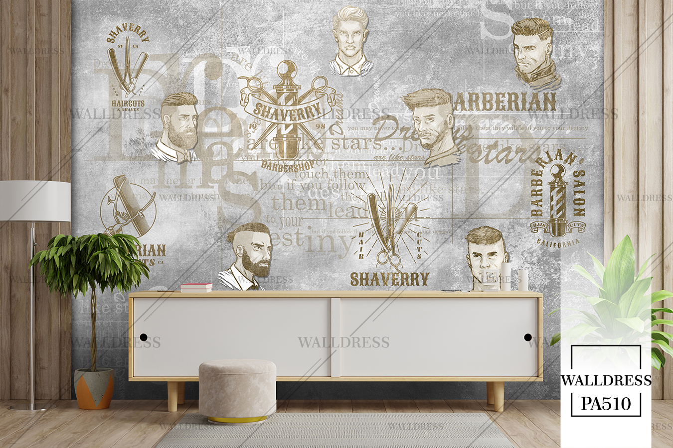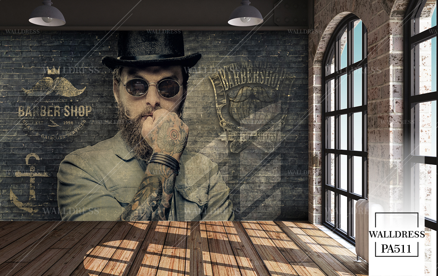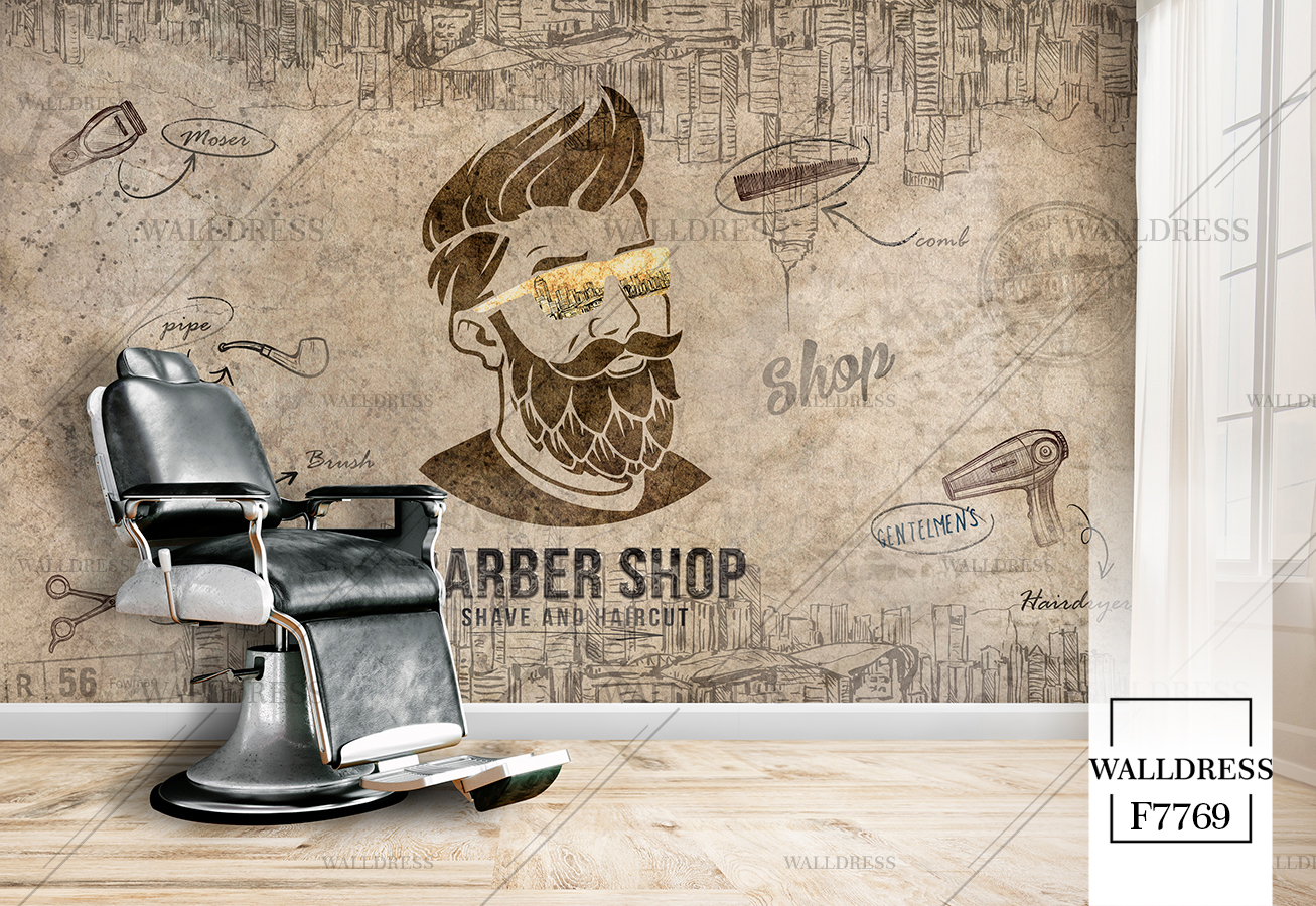 طرح جدید و لوکس و مدرن پوستر و کاغذ دیواری مردانه مخصوص باربرشاپ با طرح مدل مو، ریش و ابزار اصلاح | زمینه آجری