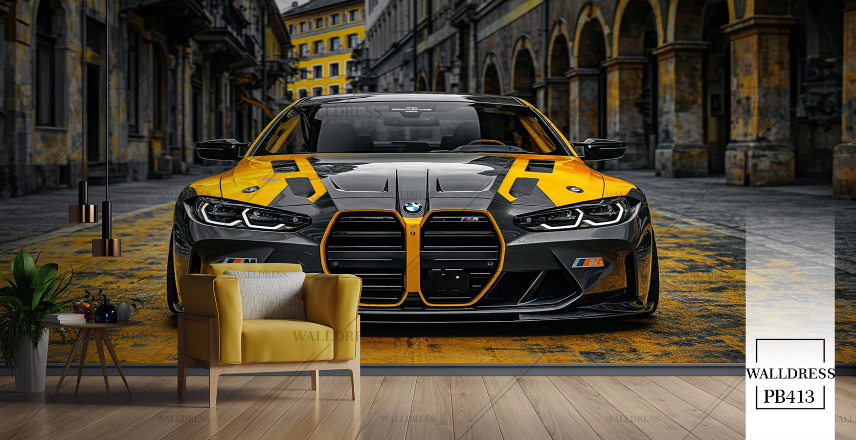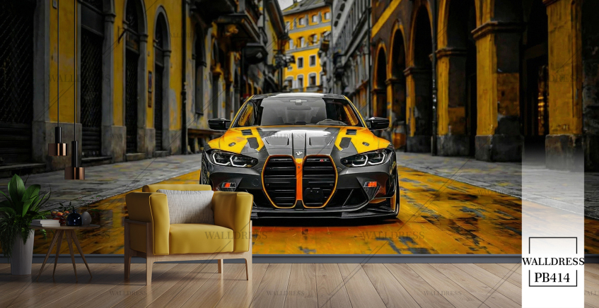 پوستر دیواری ماشین bmw زرد و مشکی رو به رو