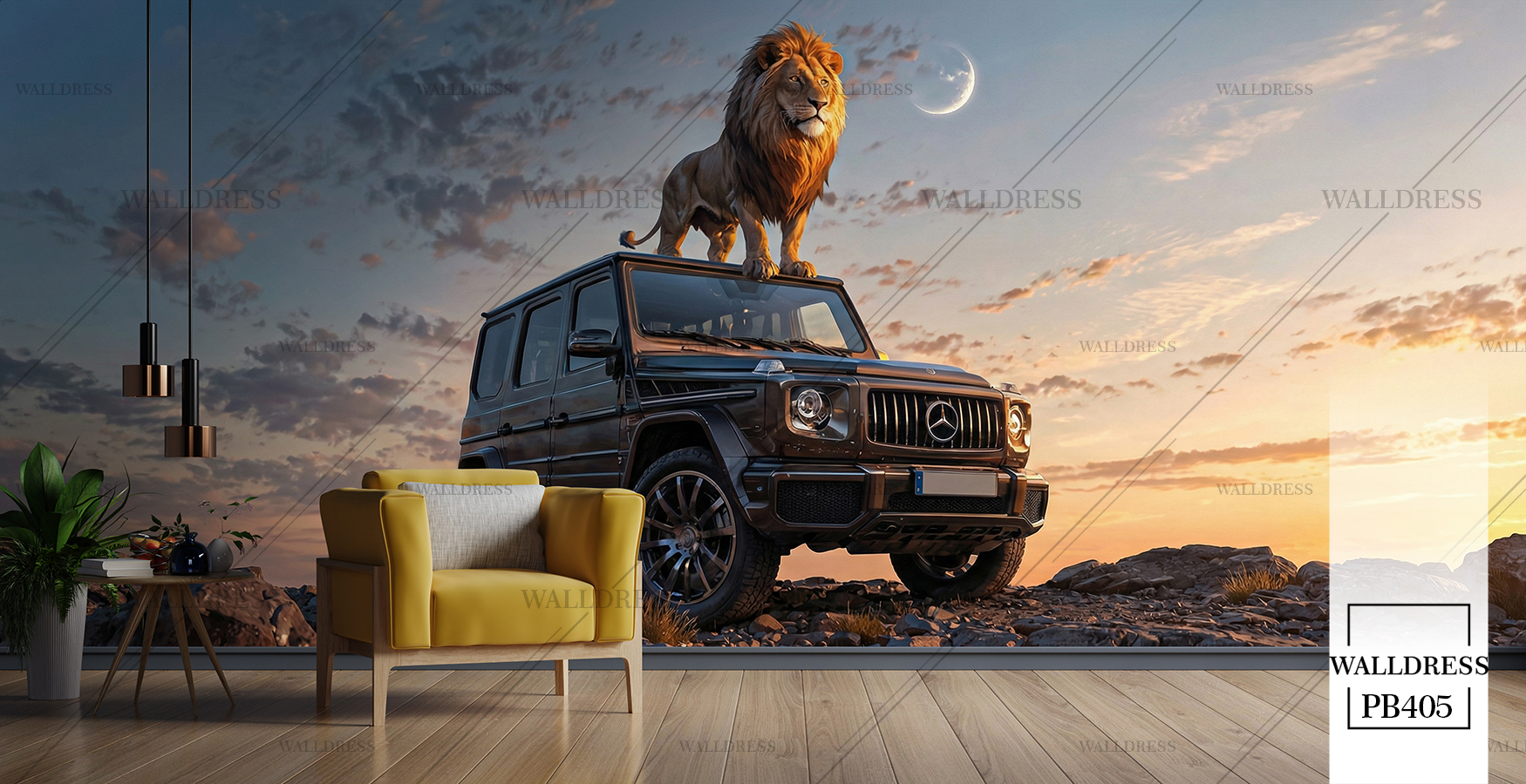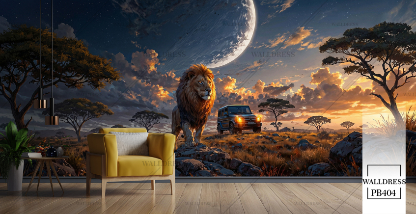 پوستر دیواری ماشین و شیر جنگل