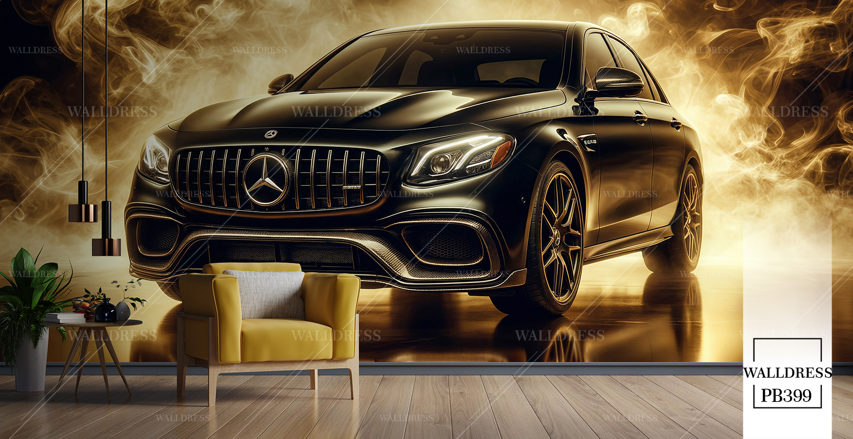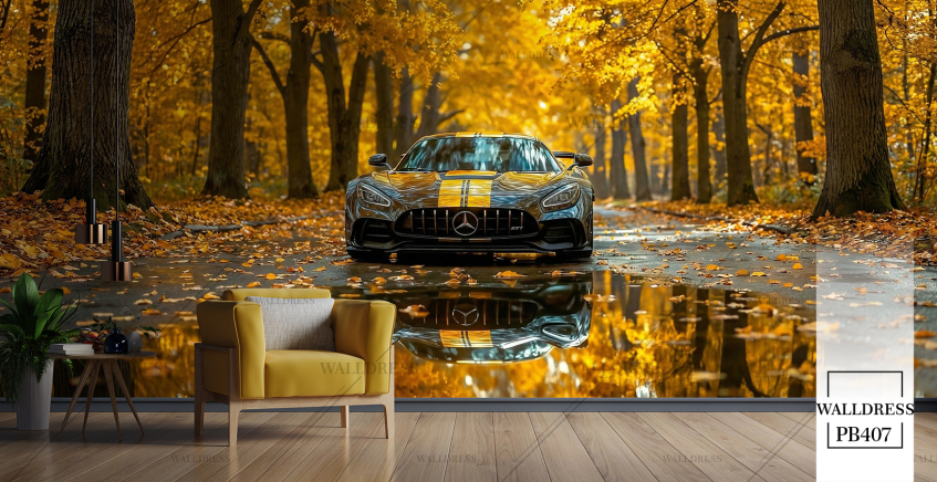 پوستر دیواری ماشین benz زرد جاده پاییزی