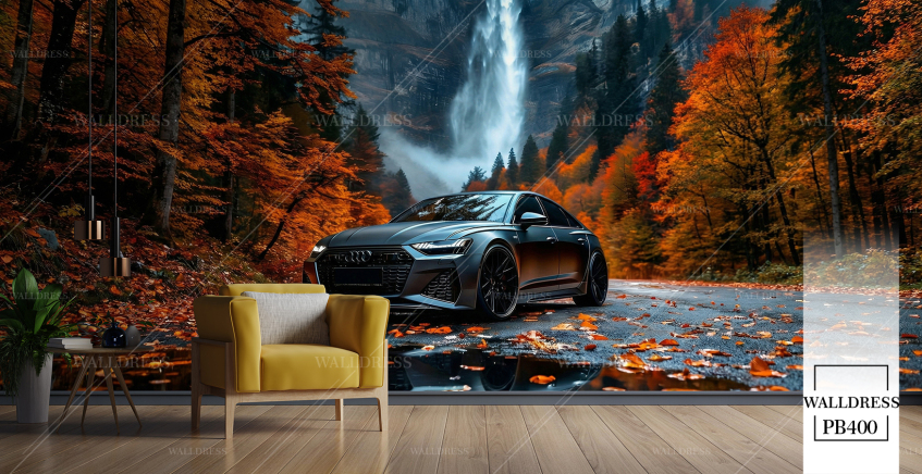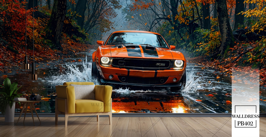 پوستر دیواری ماشین اسپرت مشکب جنگل پاییزی