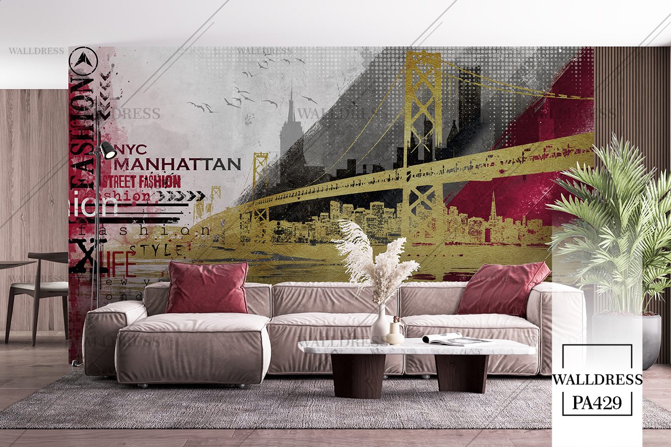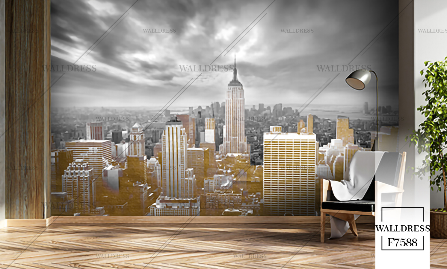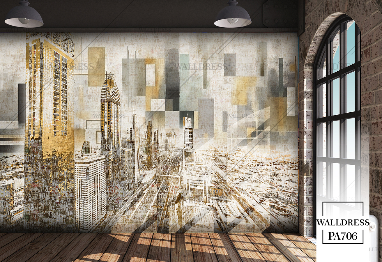 پوستر و کاغذ دیواری نمای شهر با منظره ساختمانی طراحی مدرن طبیعی و سورئال و خطوط معماری مناسب فضاهای امروزی و موسسات فروش املاک | منهتن طلایی