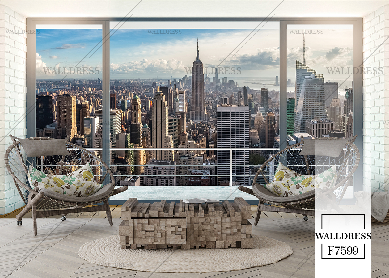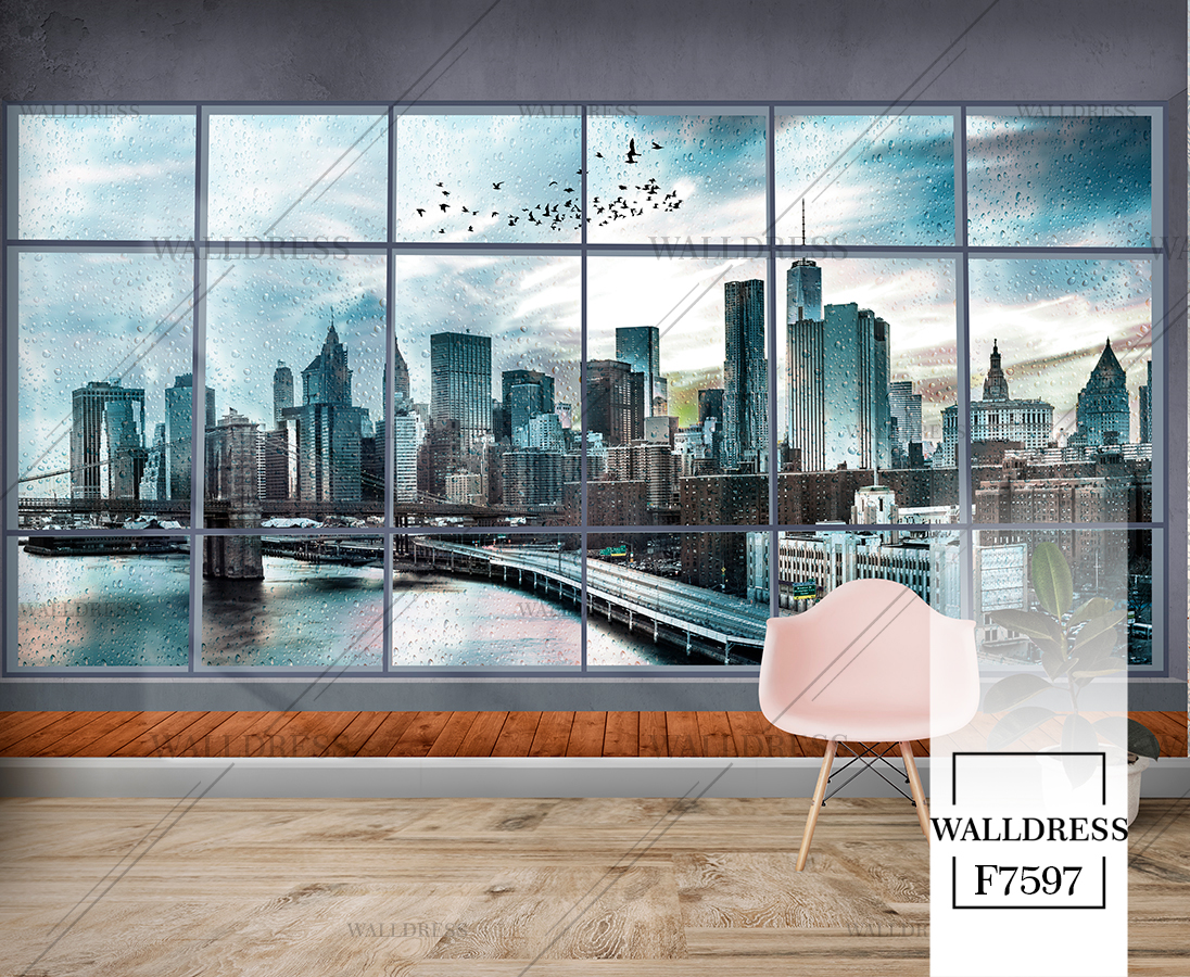 پوستر و کاغذ دیواری نمای شهر با منظره ساختمانی طراحی مدرن طبیعی و سورئال و خطوط معماری مناسب فضاهای امروزی و موسسات فروش املاک | منهتن پنجره