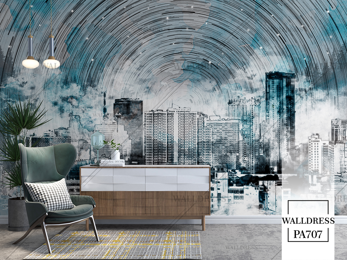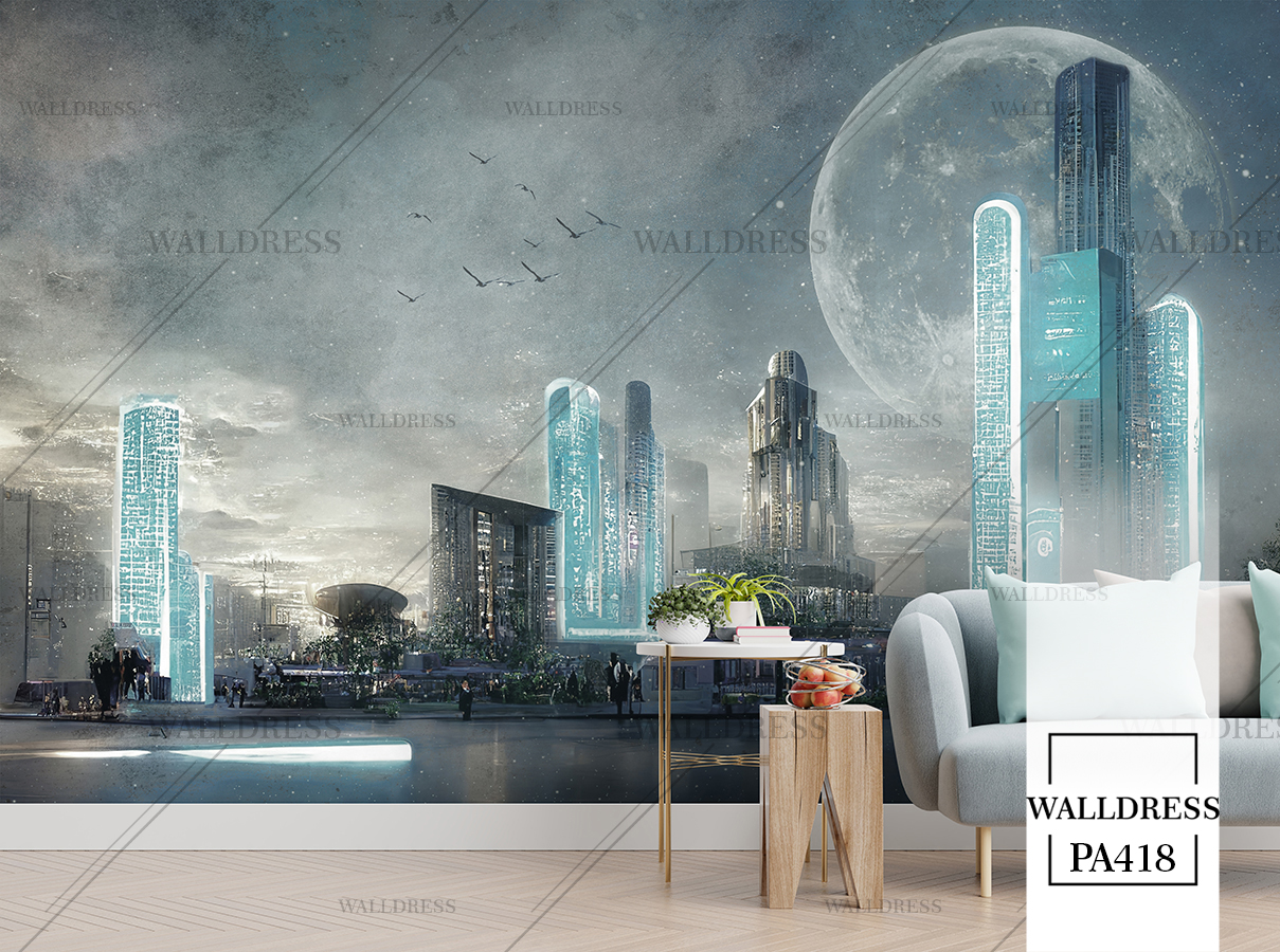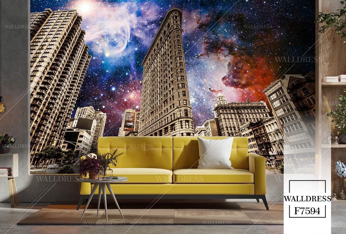 پوستر و کاغذ دیواری نمای شهر با منظره ساختمانی طراحی مدرن طبیعی و سورئال و خطوط معماری مناسب فضاهای امروزی و موسسات فروش املاک | آسمان کهکشانی