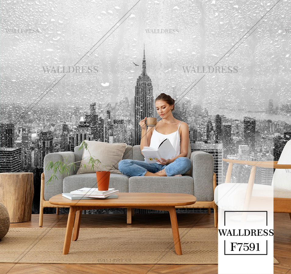 پوستر و کاغذ دیواری نمای شهر با منظره ساختمانی طراحی مدرن طبیعی و سورئال و خطوط معماری مناسب فضاهای امروزی و موسسات فروش املاک | منهتن بارانی