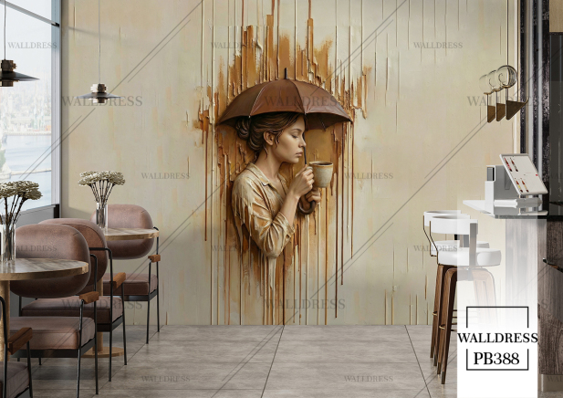 پوستر دیواری طرح دختر وچتر و فتجان قهوه تم کرم قهوه ای