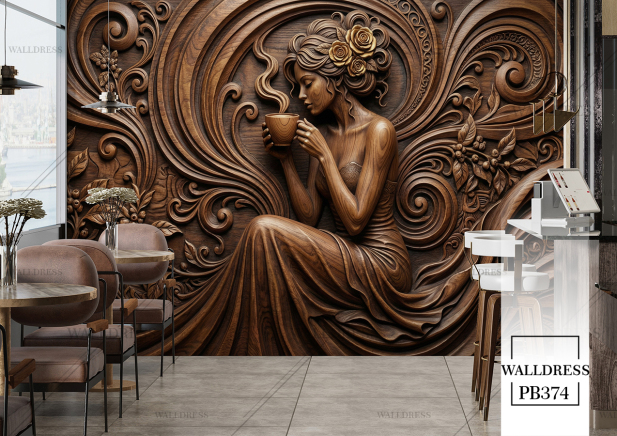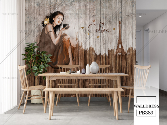 پوستر دیواری طرح دختر با قهوه زمینه چوبی تم قهوه ای