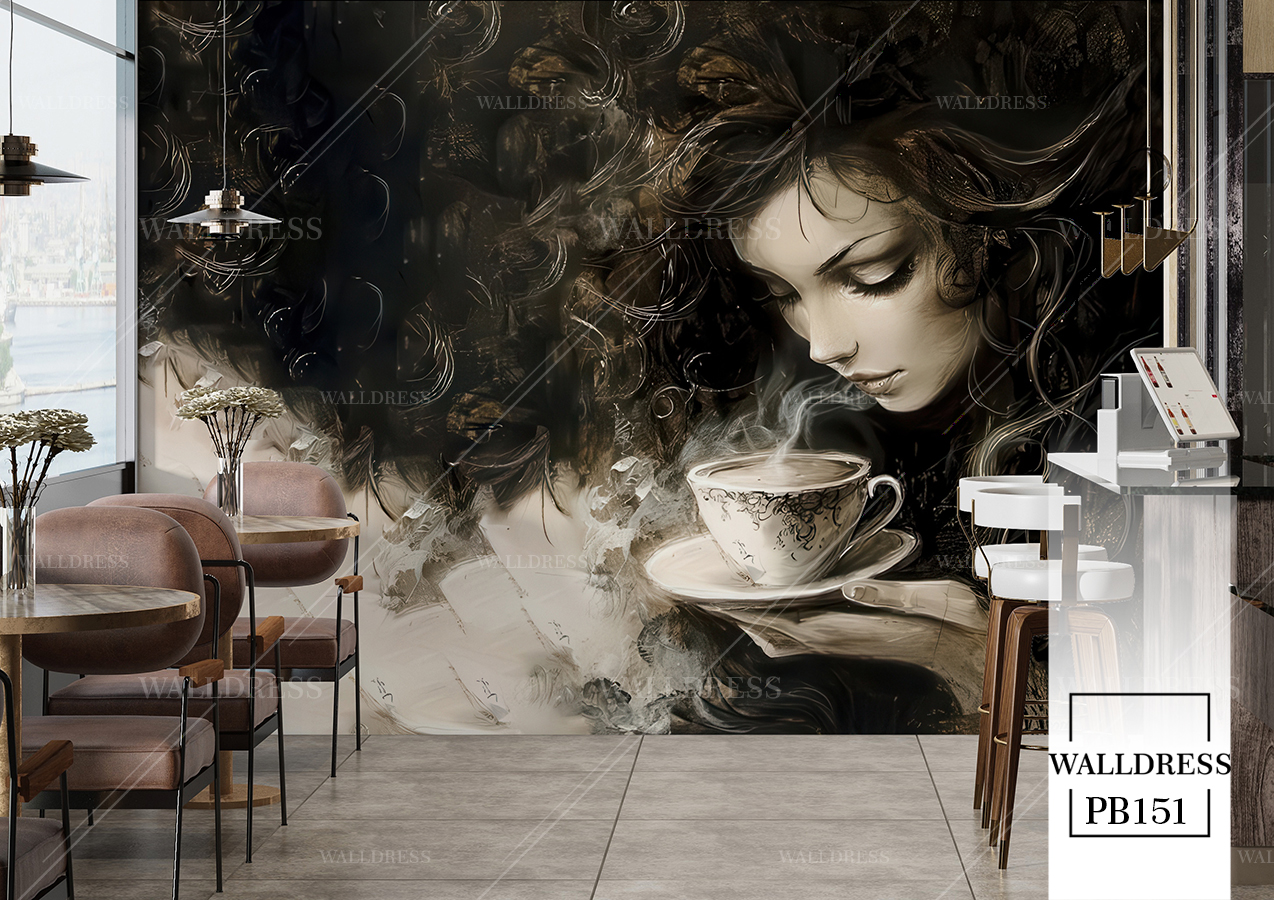 پوستر دیواری طرح زن و فنجان قهوه برای کافی شاپ