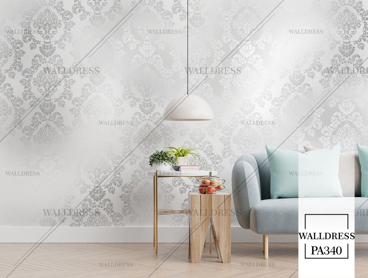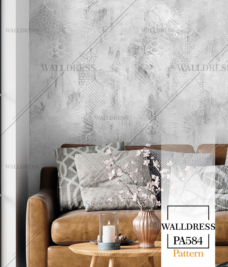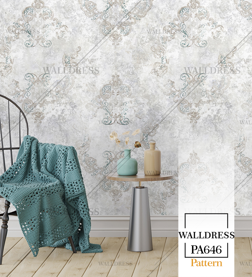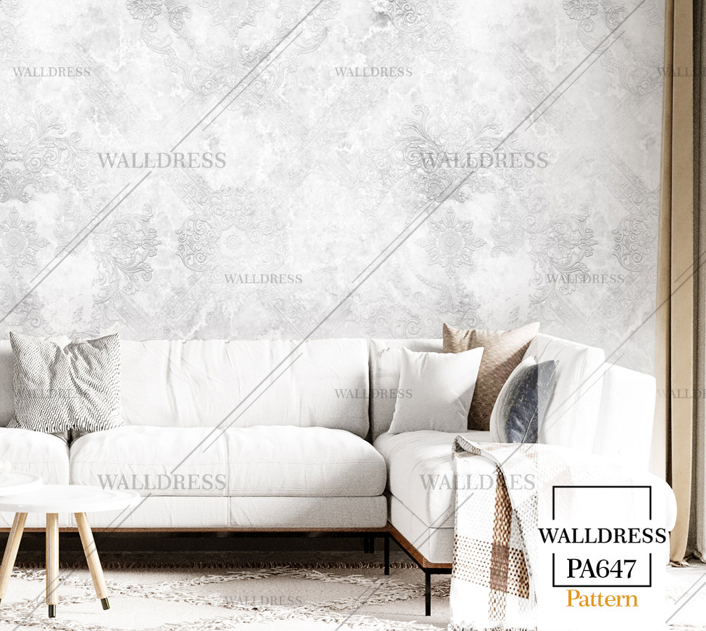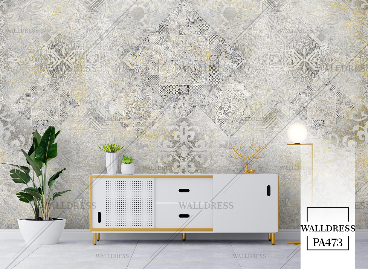 پوستر دیواری نئو کلاسیک با طراحی ظریف و تلفیق کلاسیک و مدرن با جزئیات پتینه ای مناسب فضاهای شیک و مدرن | داماسک های آینه ای و نقره ای