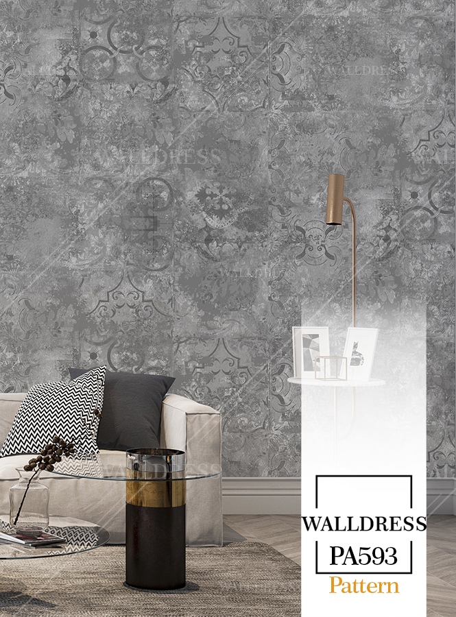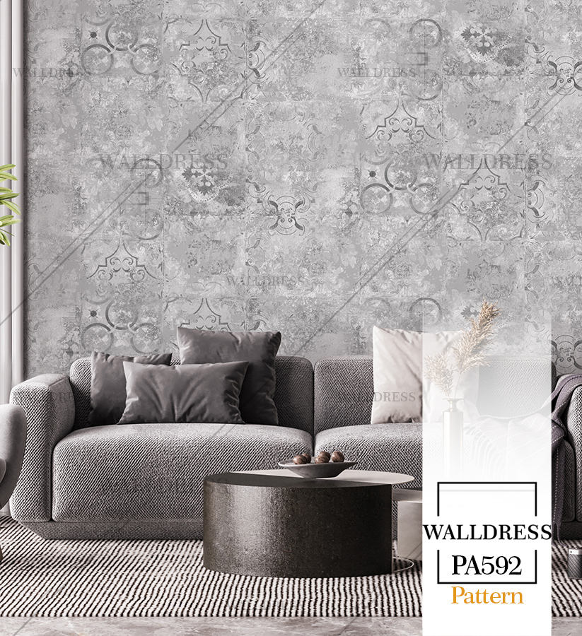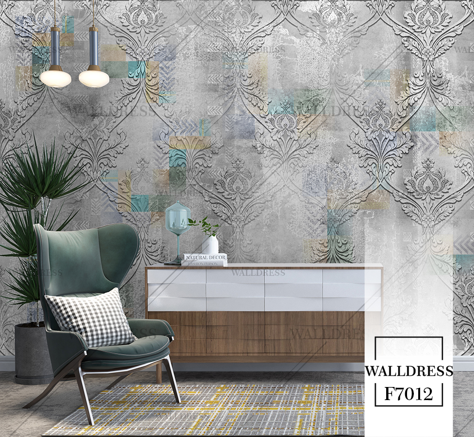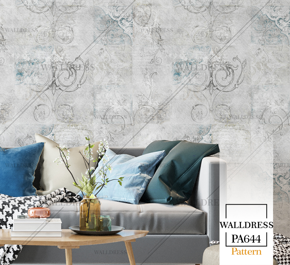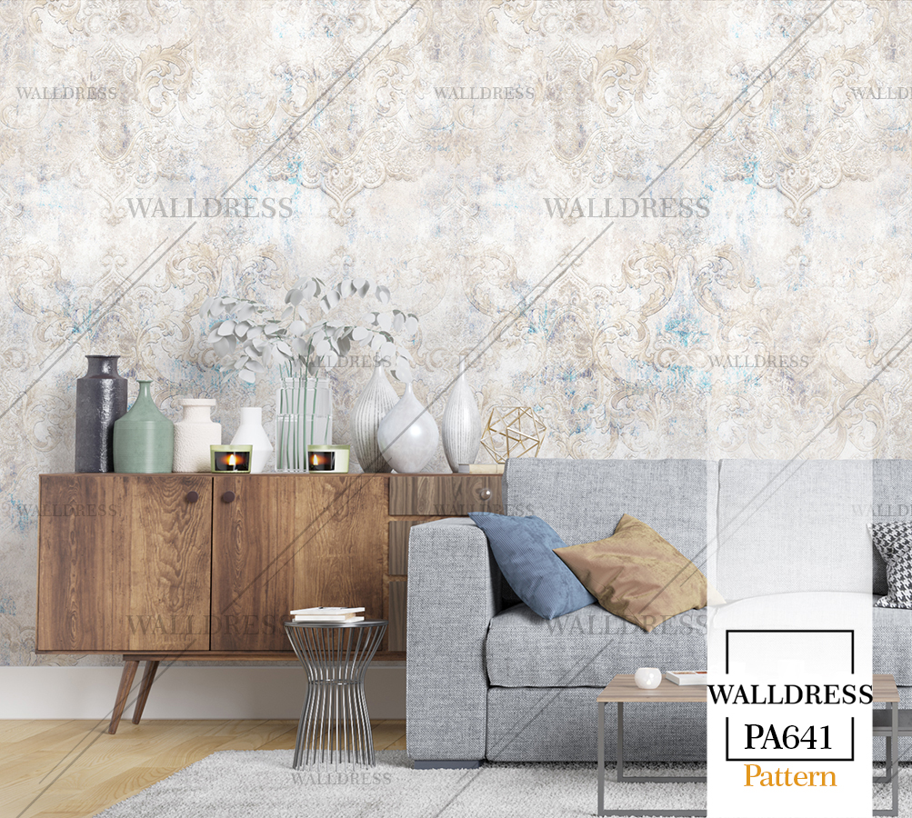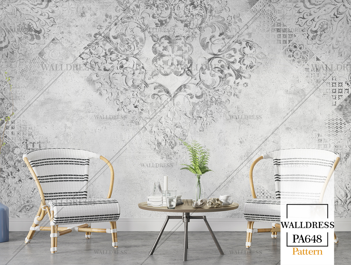 پوستر دیواری نئو کلاسیک با طراحی ظریف و تلفیق کلاسیک و مدرن با جزئیات پتینه ای مناسب فضاهای شیک و مدرن | داماسک های آینه ای و نقره ای