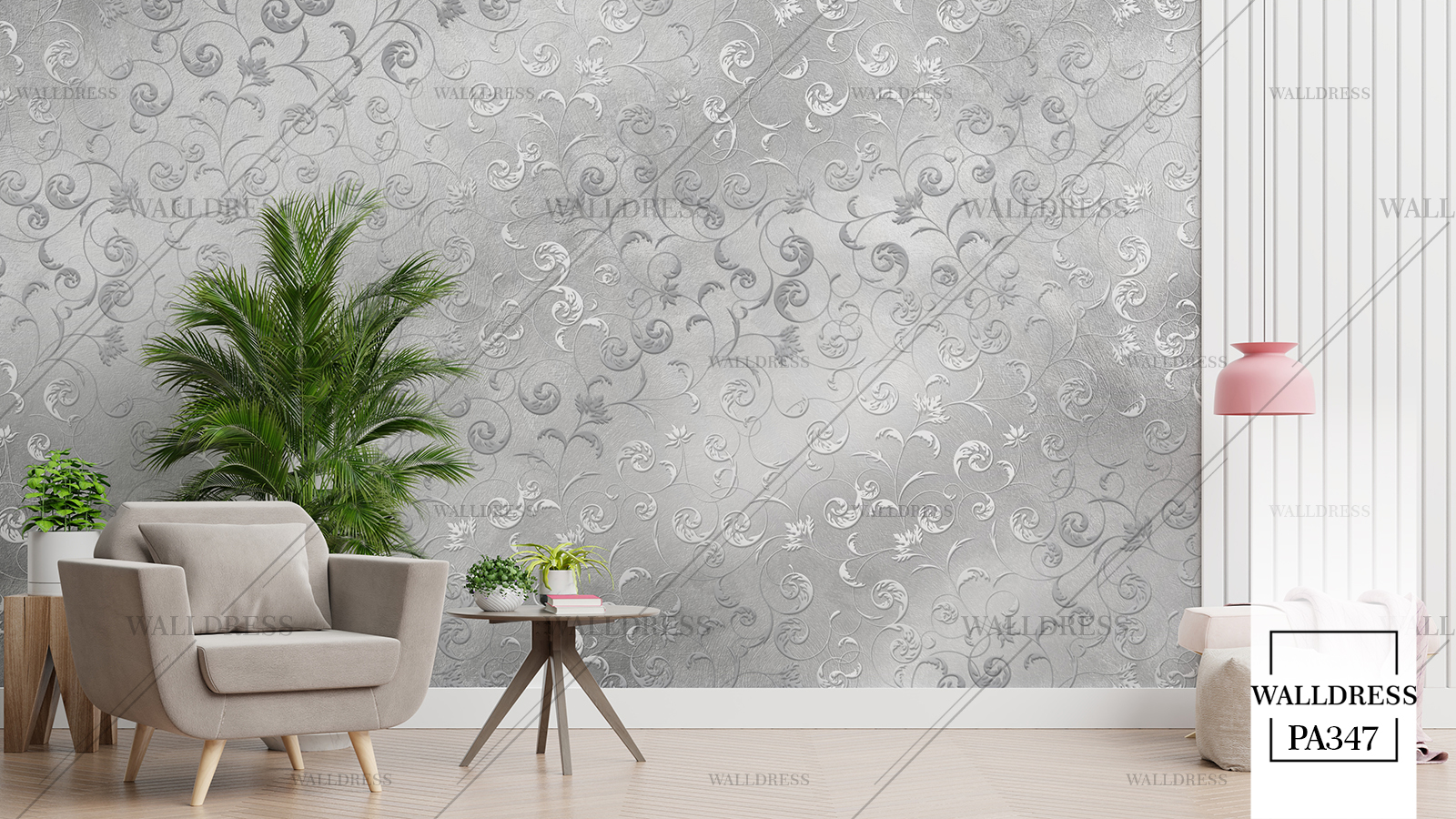 پوستر دیواری نئو کلاسیک با طراحی ظریف و تلفیق کلاسیک و مدرن با جزئیات پتینه ای مناسب فضاهای شیک و مدرن | پیچک های نقره ای