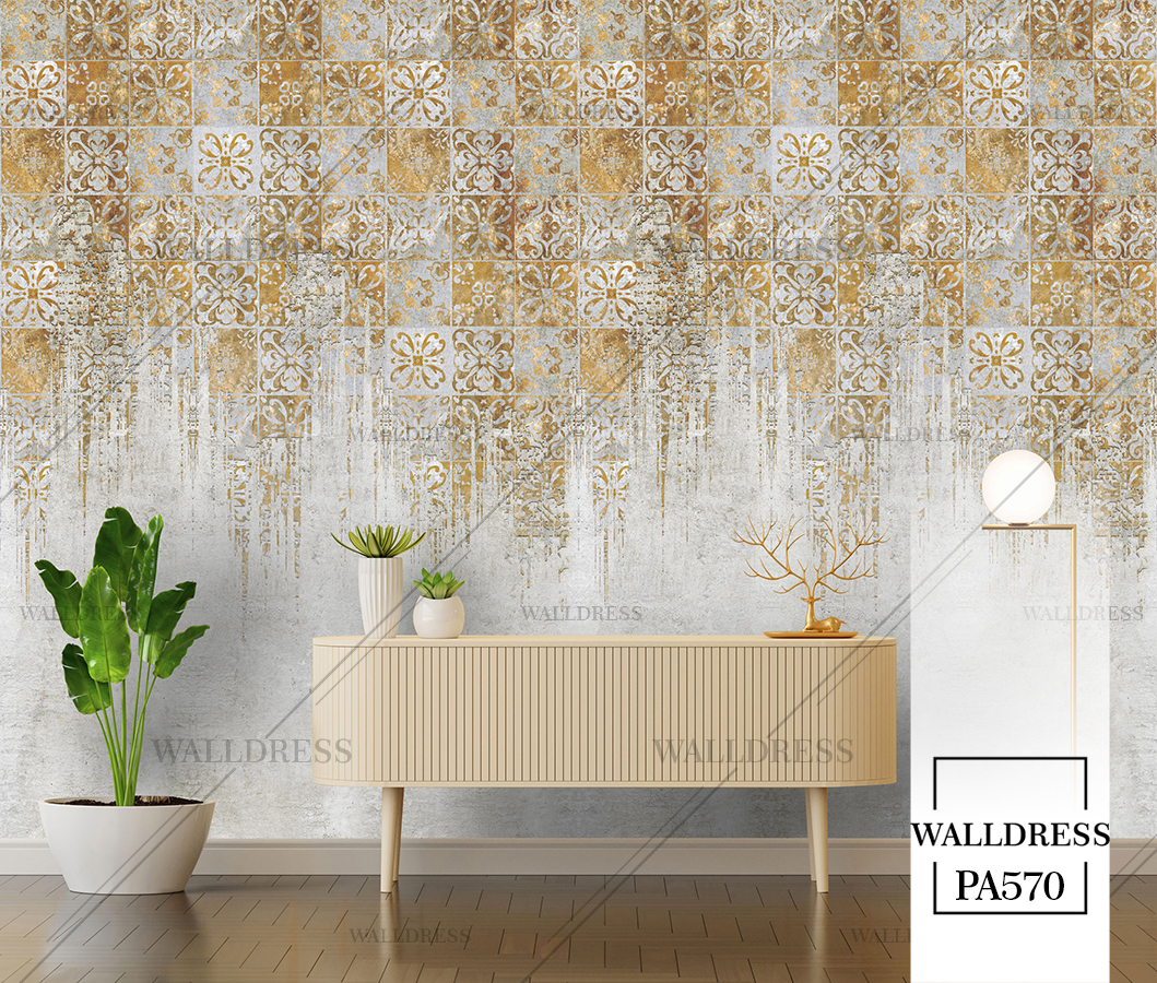 پوستر دیواری نئو کلاسیک با طراحی ظریف و تلفیق کلاسیک و مدرن با جزئیات پتینه ای مناسب فضاهای شیک و مدرن | حالت کاشی دار طلایی